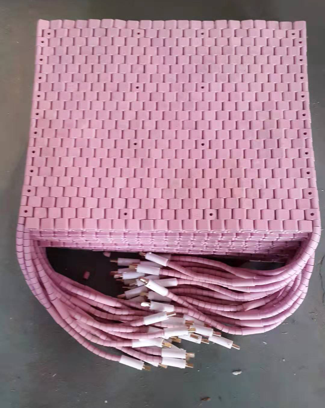 選用鎳烙絲纜作發熱源,高純度氧化鋁陶元件為絕緣體制成不同形狀的履帶式加熱器,并視工件的幾何形狀壁厚選擇相應的規格。